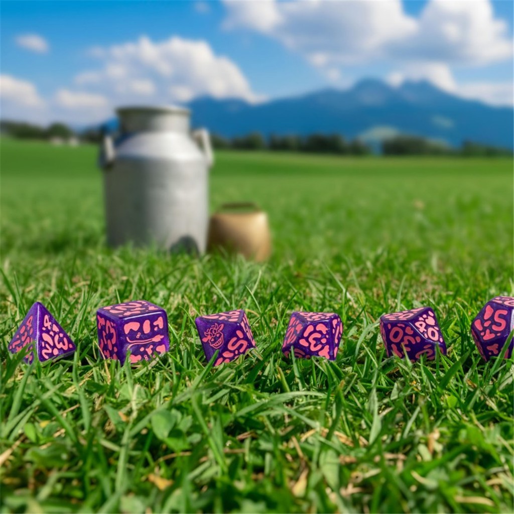 Przywitaj RaMOOnę, najjaśniejszą gwiazdę wśród kostek! Jej fioletowe, lśniące niczym gwiezdne niebo oblicze oraz urocze różowe łaty sprawią, że każdy rzut nabierze kosmicznej osobowości. W świecie, gdzie większość krów spędza dni na spokojnym przeżuwaniu trawy, RaMOOna robi wszystko inaczej – emanuje charyzmą i wprowadza na stół klimat radosnej MOOzyki.