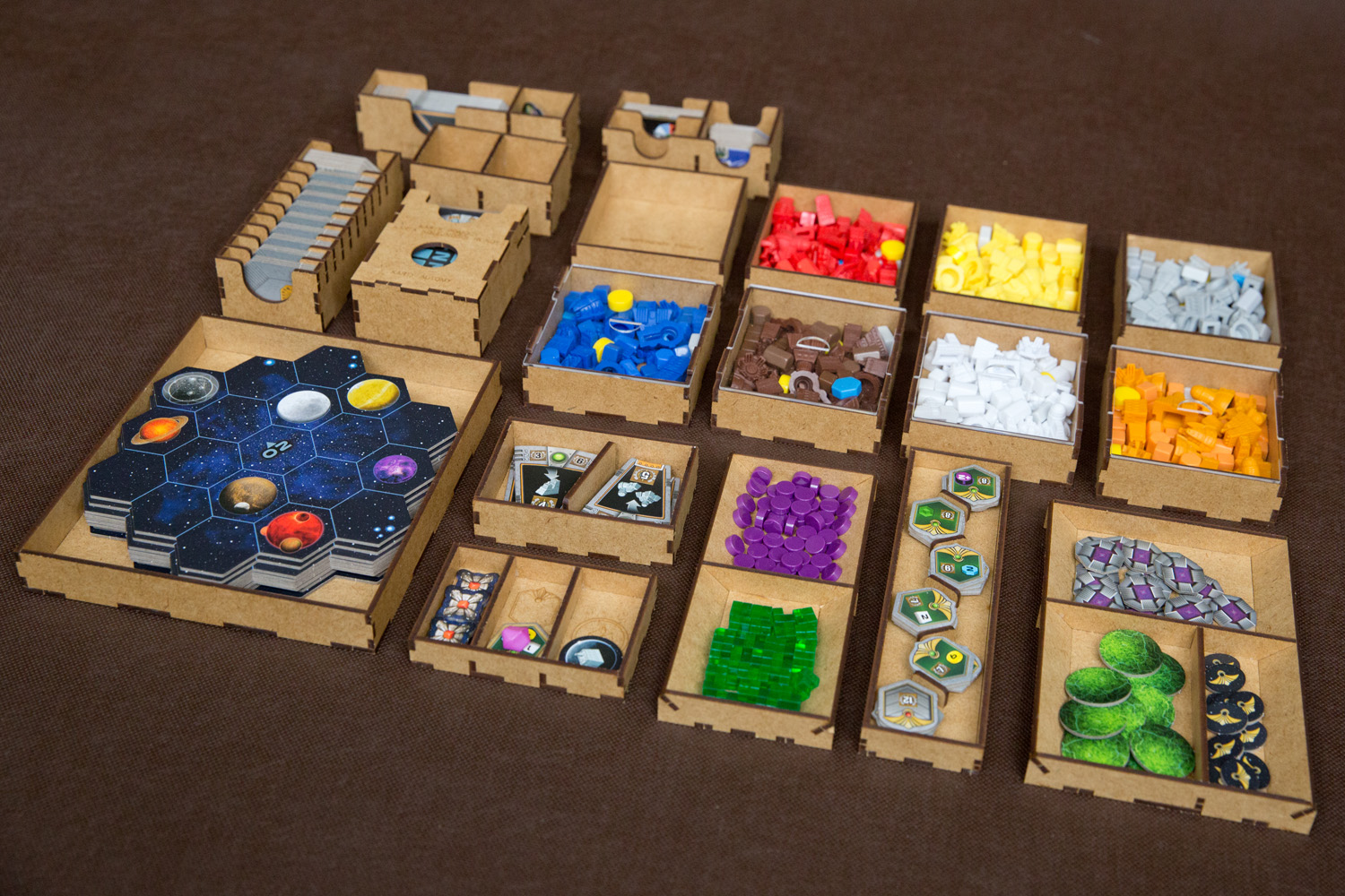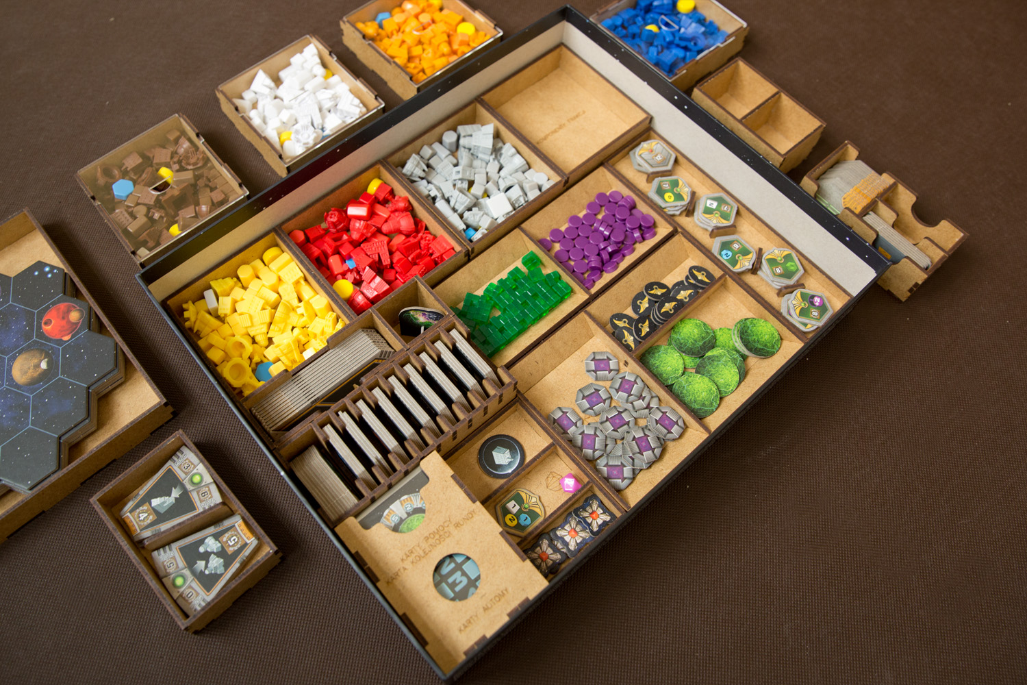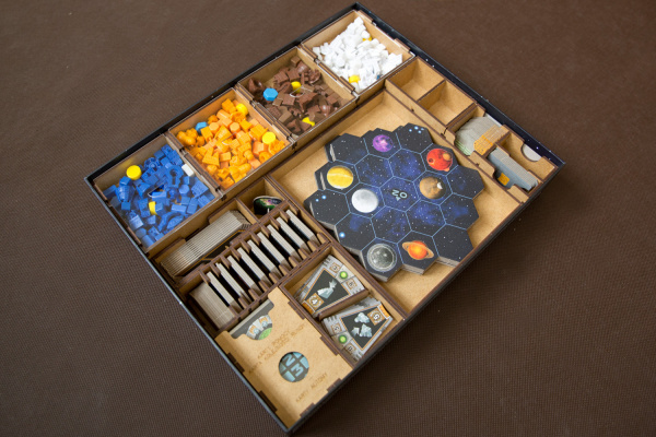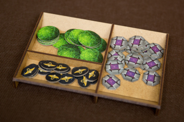 - 7 pojemników dla każdej z Frakcji mieszczące: 8 Kopalń, 4 Placówki Handlowe, 3 Laboratoria, 2 Akademie, 1 Instytut Planetarny, 3 Gajaformery, 7 znaczników Gracza, 25 Satelitów, 2 znaczniki Kredytów, 1 znacznik Rundy, 1 znacznik Wiedzy,