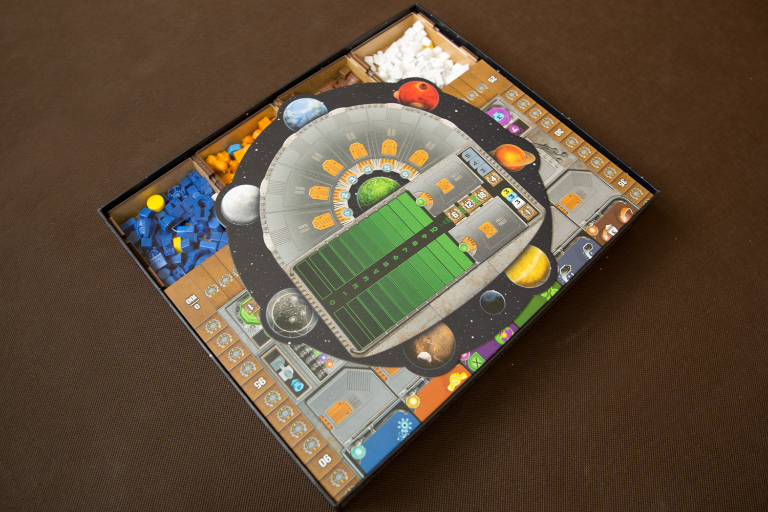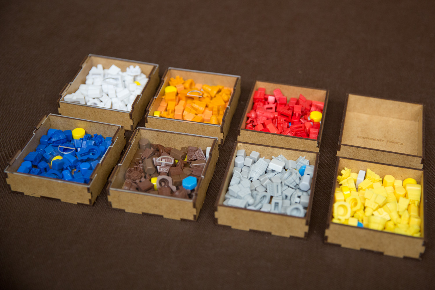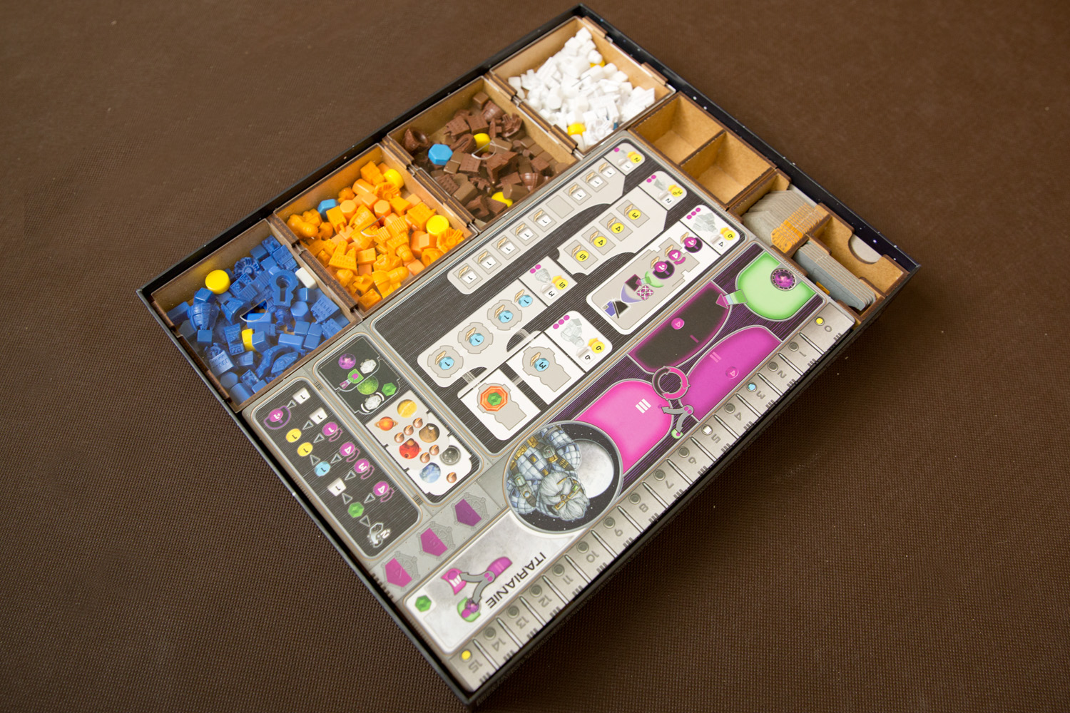 - 7 pojemników dla każdej z Frakcji mieszczące: 8 Kopalń, 4 Placówki Handlowe, 3 Laboratoria, 2 Akademie, 1 Instytut Planetarny, 3 Gajaformery, 7 znaczników Gracza, 25 Satelitów, 2 znaczniki Kredytów, 1 znacznik Rundy, 1 znacznik Wiedzy,