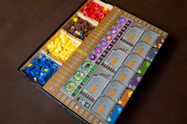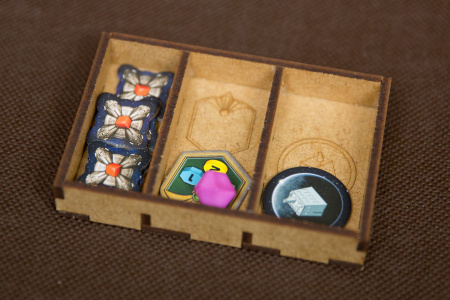 Insert zawiera pojemniki do wyłożenia na stół, które ułatwiają rozgrywkę i pomagają utrzymać porządek: