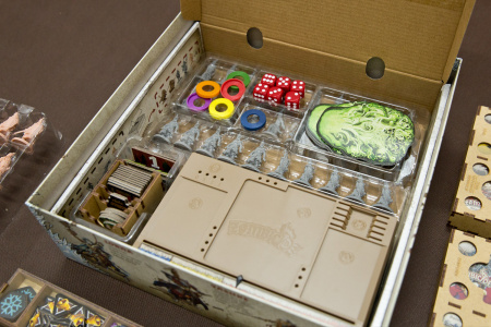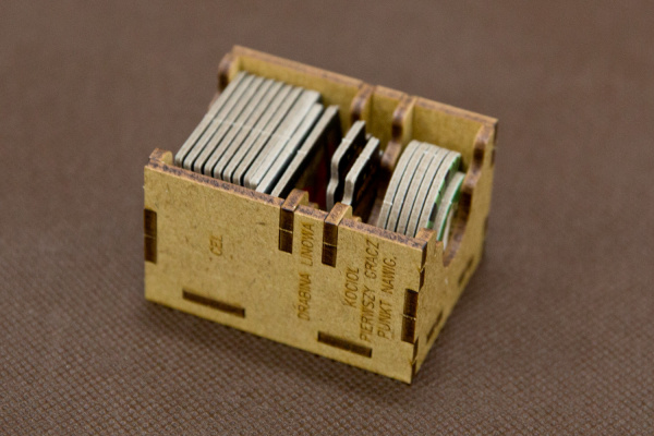 - pudło można przechowywać w pionie i nic się nie wysypie (pojemnik z żetonami jest zasuwany za pomocą pleksi),
