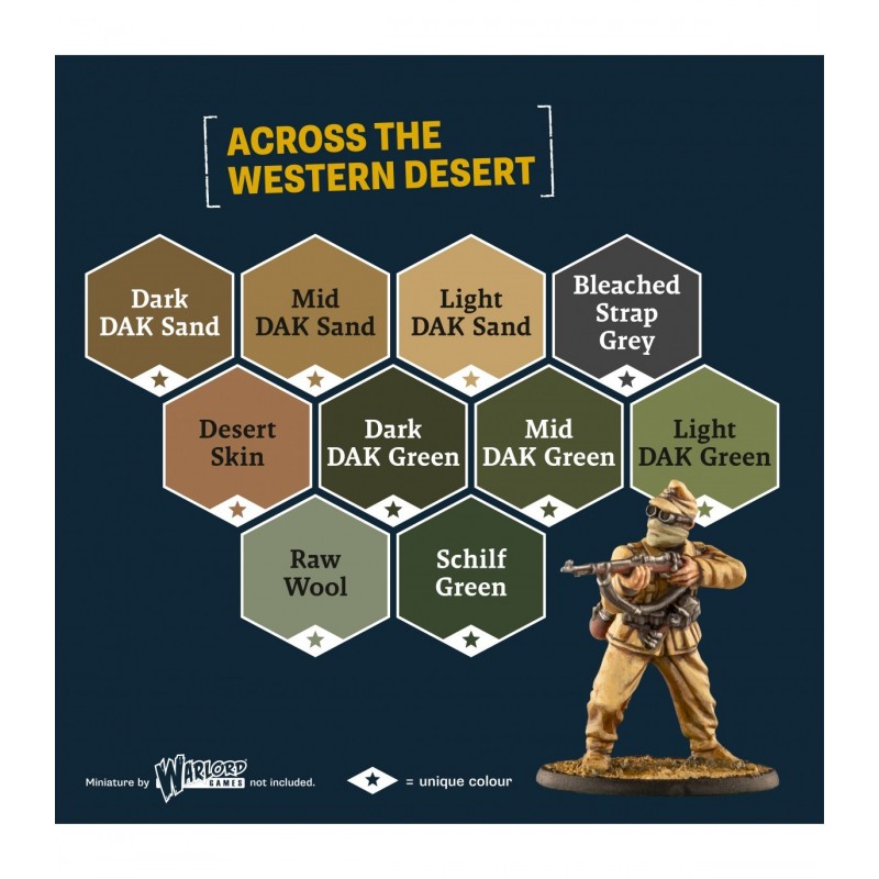Dzięki zestawowi Historical - World War II - German Afrika Korps Twoje figurki i pojazdy zyskają wygląd idealnie dopasowany do warunków pustynnych - od lekko wypłowiałych od słońca mundurów, po pancerze czołgów pokrytych charakterystycznym pyłem i śladami eksploatacji w trudnym, suchym klimacie.