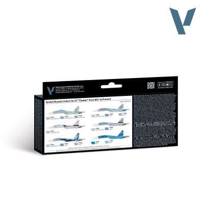 Zestaw farb Soviet/Russian Colors Su-27 "Flanker" from 80’s to Present to wyjątkowa kolekcja farb, zaprojektowana specjalnie do malowania słynnego myśliwca Su-27 używanego przez Siły Powietrzne ZSRR i Federację Rosyjską. Zestaw zawiera profile śmigłowców oraz oznaczenia kolorów wraz ze szczegółowym opisem ich zastosowania. Kolory zawarte w zestawie: 71.317 AII SV. Gol Light Blue 71.333 Russian AF Blue 71.334 Flanker Light Blue 71.335 Flanker Light Gray 71.337 Flanker Blue 71.343 Russian AF Grey N.7 71.344 Russian AF Grey Protective Coat 71.345 Russian AF Grey N.8