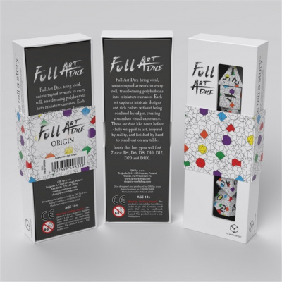 Zestaw kości Full Art: Origin to wyjątkowy zestaw, który oddaje hołd wielościanom – idealnym kształtom, symbolom porządku i nieskończoności. Hipnotyzujące wzory z motywem konturów brył to prawdziwa uczta wizualna, gdzie każdy rzut odkrywa nowy wymiar piękna i perfekcyjnej symetrii.