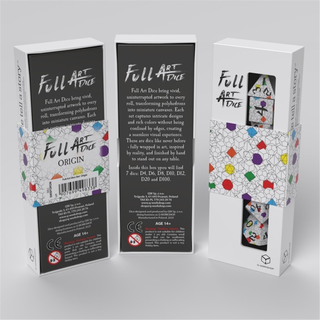 Zestaw kości Full Art: Origin to wyjątkowy zestaw, który oddaje hołd wielościanom – idealnym kształtom, symbolom porządku i nieskończoności. Hipnotyzujące wzory z motywem konturów brył to prawdziwa uczta wizualna, gdzie każdy rzut odkrywa nowy wymiar piękna i perfekcyjnej symetrii. Dlaczego warto? Wyjątkowy design – Hipnotyzujące, geometryczne wzory inspirowane ideą doskonałości kształtu. Pełnokolorowy nadruk – Zaawansowana technologia zapewnia płynne przejścia wzorów pomiędzy ściankami. Precyzja i czytelność – Wyraźna runiczna czcionka tworzy idealną równowagę między estetyką a funkcjonalnością. Starannie zaprojektowane kości – Dopracowane w każdym detalu, stworzone z myślą o trwałości i zachwycie. Symbolika i inspiracja – Powrót do prostoty i wyrafinowania.