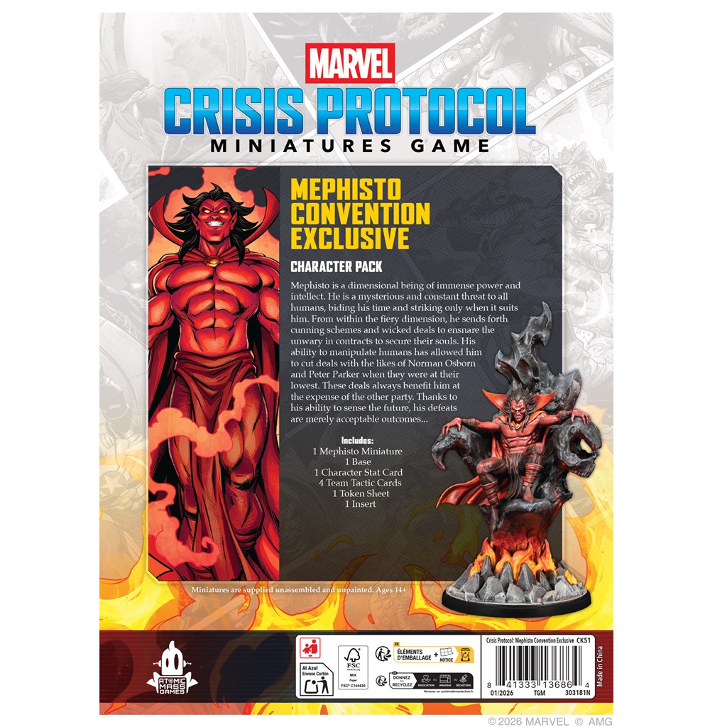 Mephisto Convention Exclusive to ekskluzywna edycja kolekcjonerska dostępna tylko w wersji angielskiej, bez przewidzianych przedruków ani lokalizacji. Przedstawia alternatywną figurkę Mephisto - w unikalnej odsłonie, różniącej się od pierwotnej wersji znajdującej się w zestawie Marvel: Crisis Protocol - Mephisto Character Pack (CP66).