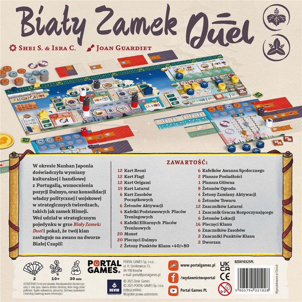 W Białym Zamku: Duel dwa klany rywalizują o wpływy na Dworze Białej Czapli. Autorzy Białego Zamku powracają z tytułem, który atmosferą, kombosami i zwartością wzoruje się na oryginale, ale proponuje zupełnie nową, równie pochłaniającą rozgrywkę dla dwóch graczy. Esencja Białego Zamku - choć nie ma tu kości i mostków, Duel oferuje podobne wyzwanie jak gra oryginalna. Daj się zabrać w znajome rejony i podejmij nowe wyzwanie zaprojektowane specjalnie dla dwóch graczy. Mała, a duża - gabarytowo niewielkie pudełko wypełnione jest komponentami, a sama rozgrywka pozwoli ci raptem w pół godziny rozegrać głęboką, wielowarstwową grę euro. Jak w domu - intuicyjny system oznaczeń i ikon, czytelny projekt i kompaktowa przestrzeń gry – zorientowanie się na planszy zajmuje ledwie chwilę, zwłaszcza jeśli znasz Biały Zamek. Gamerskie Haiku - każdy ruch ma znaczenie, a każdy manewr uruchamia całą sekwencję efektów. Przed tobą 12 rund, z których nie wolno ci zmarnować ani jednej!