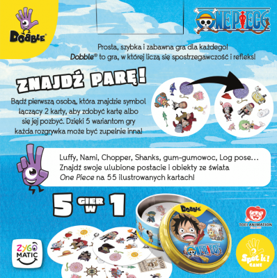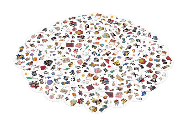 Zabierz Luffy’ego, Zoro, Nami, Usoppa oraz Sanjiego gdzie tylko zechcesz i baw się, szukając par w popularnej grze towarzyskiej! Spójrz na pierwszą kartę, którą trzymasz w ręku oraz na tę, która leży na środku stołu. Znajdź na nich wspólny symbol, nazwij go i szybko pozbądź się swojej karty. Teraz następna! Tylko nie zwątp, dwie karty zawsze łączy dokładnie jeden wspólny obrazek!