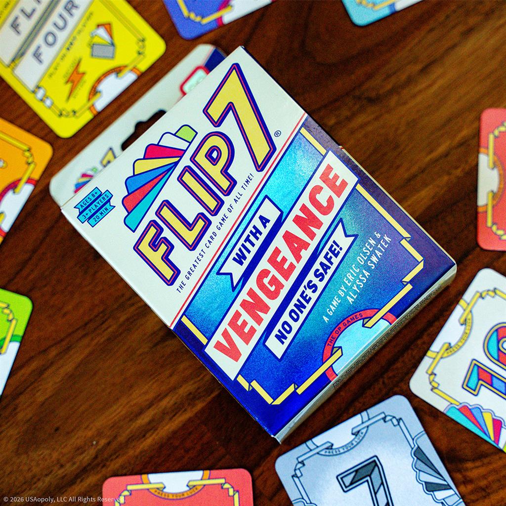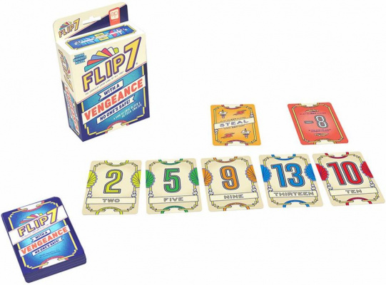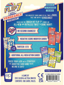 Flip 7: With a Vengeance to zupełnie nowa odsłona popularnej karcianki opartej na kuszenie losu. W każdej turze decydujemy, czy podejmujemy ryzyko, próbując powiększyć nasz dorobek punktowy, czy też wolimy spasować i zachować to, co już udało nam się zebrać. Nowa wersja to jeszcze więcej brudnych zagrywek i talia naszpikowana pułapkami, przez które droga do zwycięstwa będzie znacznie bardziej wyboista!