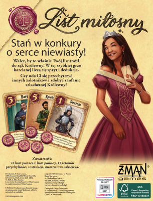 Wciel się w jednego z absztyfikantów i zrób wszystko, by to właśnie Twoja wiadomość dotarła prosto do rąk królewny! List miłosny do dynamiczna gra łącząca spryt, dedukcję i blefowanie – wszak gdy w grę wchodzi miłość, wszystkie chwyty są dozwolone! Podczas zabawy wykorzystujemy zgromadzone na ręce karty sojuszników, przyjaciół i członków rodziny królewskiej, by przejrzeć szyki przeciwników i wyeliminować ich z rywalizacji. Czy uda Ci się przechytrzyć innych zalotników i zdobyć zaufanie szlachetnej królewny?