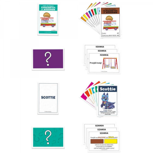 W zestawie: dwustronna plansza, 6 kolorowych pionków (np. samochodzik, pingwin, kaczuszka, mały dinozaur itp.), osobne karty i pieniądze dla obu poziomów gry, znaczniki „sprzedane”, kostka i instrukcja.