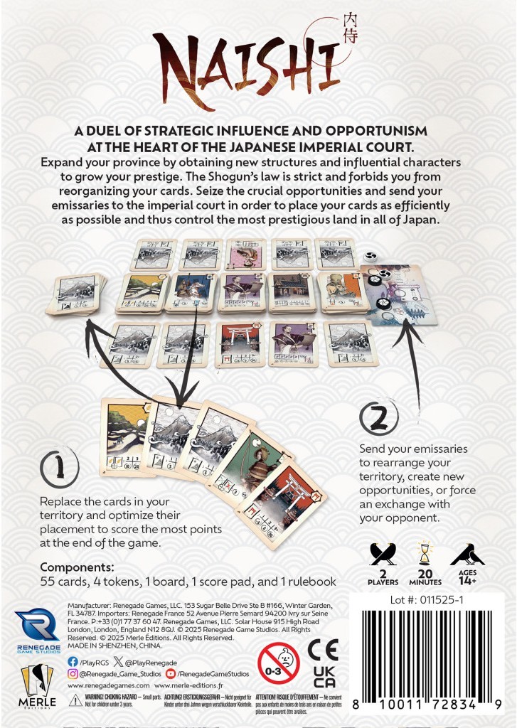 W grze Naishi wcielisz się w przywódcę japońskiego państwa, którego celem jest rozwój i doskonalenie swojego regionu w jak najbardziej efektywny sposób. Jednak planowanie nie będzie proste – stosowanie się do ustalonych zasad rozmieszczania kart oznacza, że każda decyzja musi być dokładnie przemyślana. Twoje umiejętności strategiczne oraz spryt zadecydują, czy zdominujesz rywali i osiągniesz sukces!