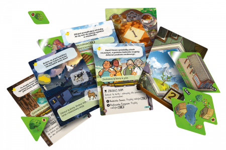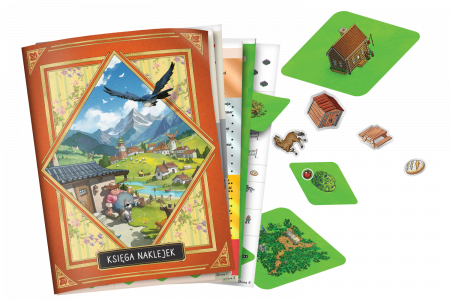 - W pudełku znajdziemy książeczkę z 800 naklejkami, którymi stopniowo będziemy wypełniać mapę, odnotowując nasz postęp i skutki podejmowanych decyzji. Mamy dość dużą dowolność w rozmieszczeniu elementów, więc na przestrzeni gry stworzymy unikalny krajobraz naszej wioski i okolic.