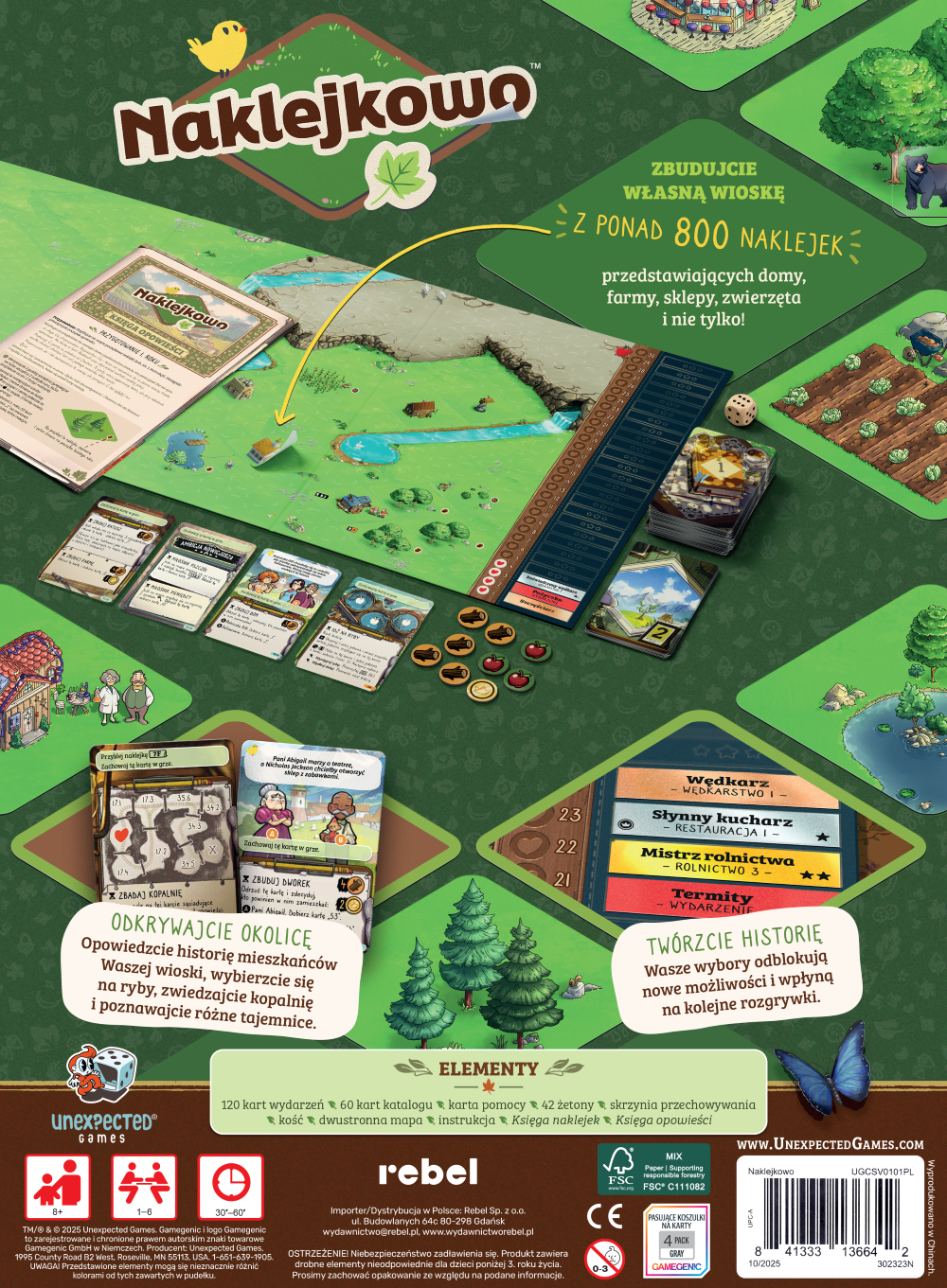 Naklejkowo to przytulna gra rodzinna, w której wspólnie rozwijamy wioskę, odkrywając przy okazji historie jej mieszkańców. Opowieść będzie toczyła się na przestrzeni 10 lat, a każda podjęta przez nas decyzja wpłynie na opisywane wydarzenia i zadowolenie poszczególnych osób, prowadząc nas do 1 z 5 unikalnych zakończeń. Postęp będziemy odnotowywali za pomocą naklejek, umieszczając na mapie kolejne budynki i postacie, a także zapisując kamienie milowe naszej opowieści.