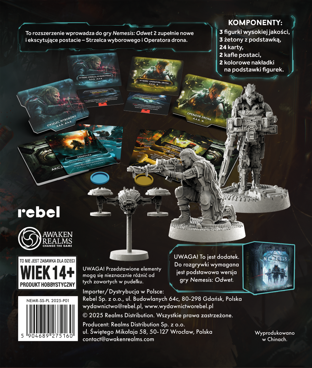 Zwiększ swoje szanse w walce z intruzami dzięki dołączeniu do zespołu dwóch nowych specjalistów: Strzelca wyborowego oraz Operatora drona. Nemesis: Odwet - Oddział wsparcia to rozszerzenie, które możesz dowolnie łączyć z innymi. Wystarczy, że dodasz nowe karty wyboru postaci do pozostałych, a następnie przygotujesz grę w standardowy sposób.