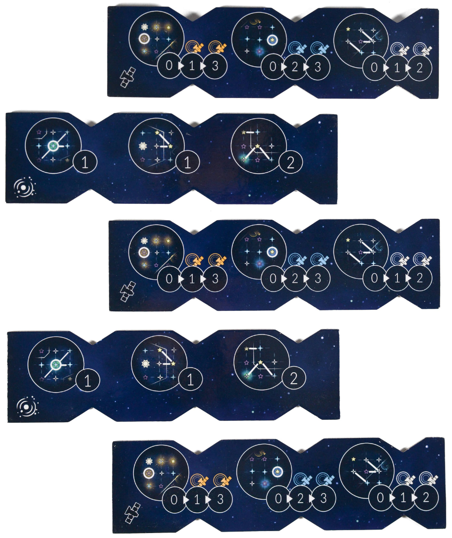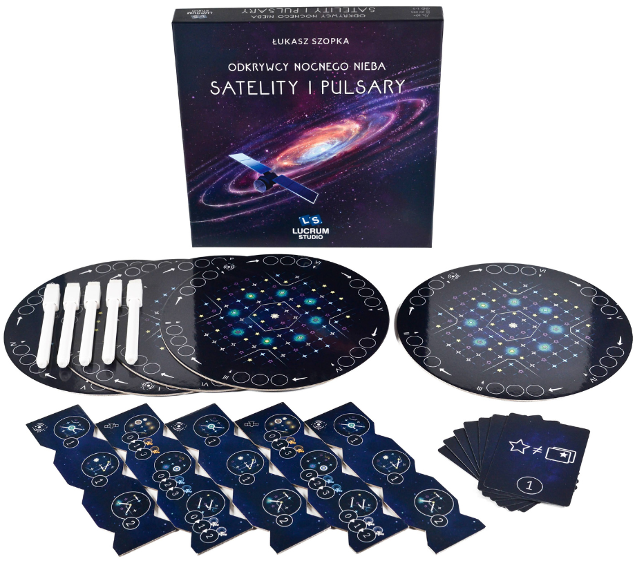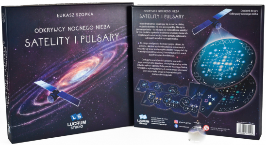 Satelity, pulsary, nowe linie horyzontu… Odkrywcy nocnego nieba: Satelity i pulsary to rozszerzenie wprowadzające trzy moduły, a wraz z nimi świeże mapy, nowe zasady i elementy zdobywające punkty, a także unikalne karty, które umożliwią zdobycie dodatkowych punktów w rundach. Moduły można dodać do rozgrywek osobno lub w dowolnej kombinacji. Działają one także z minidodatkiem Zodiak!