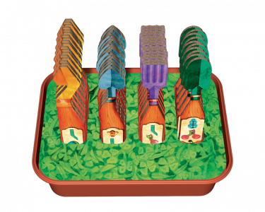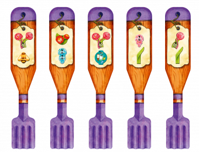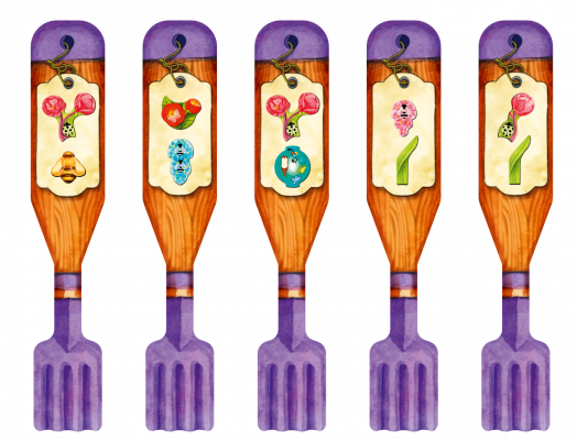 - Na początku swojej tury wybieramy 1 z 4 dostępnych narzędzi. Znajdziemy na nim elementy, które dobieramy ze wspólnych zasobów, głównie różne rodzaje roślin. Oprócz tego pod narzędziami znajduje się specjalna planszetka z akcjami – w dalszej części tury możemy wykonać akcję przypisaną do narzędzia, które wybraliśmy.