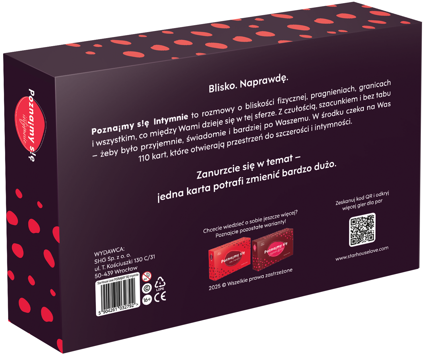 Poznajmy się Intymnie łączy lekkość i odwagę – pozwala rozmawiać o intymności bez skrępowania, z humorem i czułością. Idealna dla par, które chcą odkrywać nowe wymiary bliskości.