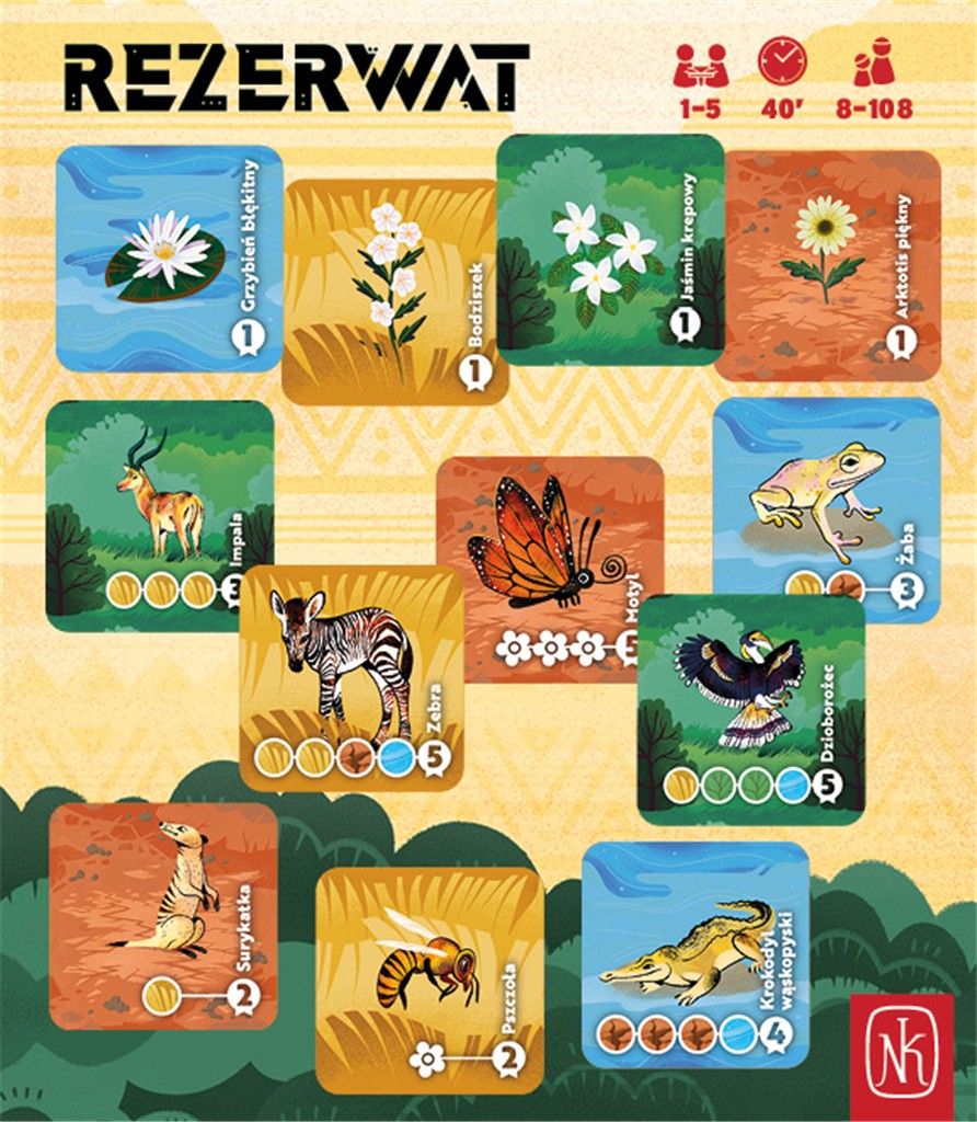 - 134 płytki (76 zwierząt, 20 kwiatów, 12 bramek, 8 turystów, 6 podwójnego terenu, 8 punktów widokowych, 4 kempingi)