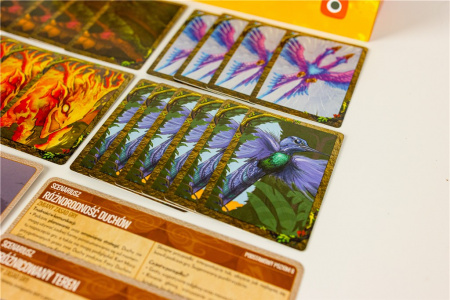 Pradawne żywioły się budzą! Wszyscy, bez względu na to, jaki żywioł nami włada, odpowiadamy na wezwanie naszej Wyspy. Ruszają nawet ci, którzy do tej pory pozostawali w cieniu. Teraz jednak ich siła jest niezbędna. Przybywają Pióra i Płomienie, nowe rozszerzenie gry Spirit Island! Karty Aspektów - Karty Aspektów pozwalają na odkrycie nowych możliwości znanych już Duchów, przedstawiając dany aspekt natury Ducha w nowy sposób. Ten mini dodatek zawiera Aspekty czterech Duchów z gry podstawowej o najniższym poziomie złożoności. Bonusy toru Obecności i Ocalanie od zniszczenia - Nowe Duchy posiadają na swoich Torach Obecności bonusy inne od tych z gry podstawowej. Z kolei kilka efektów może powstrzymać Zniszczenie Dahan lub Najeźdźców. Izolacja - Dzięki niektórym Mocom nowych Duchów możecie Izolować krainy. Oznacza to, że Najeźdźcy znajdujący się w danej krainie są uwięzieni, ugrzęźli albo w inny sposób stali się niezdolni do przemieszczania. Królestwo Szkocji - To Przeciwnik wyraźnie łatwiejszy dla Duchów, które mogą pomijać Akcje Najeźdźców i wyraźnie trudniejszy dla Duchów mających problem z powstrzymaniem Budowy Miast w Nadbrzeżnych krainach. Atuty Nowe rozwinięcie kooperacyjnego klasyka. Po raz pierwszy po polsku.