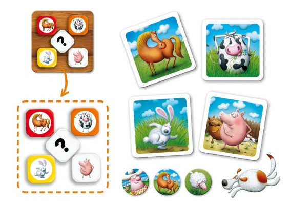 - Gracze rywalizują ze sobą, próbując jak najszybciej ułożyć za pomocą kostek układ zwierząt przedstawiony na odkrytej karcie. Ten, kto zrobi to pierwszy, zdobywa żeton zwierzęcia.