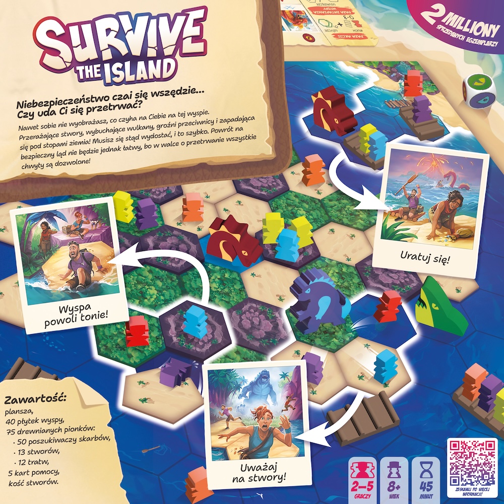 - Survive the Island to prosta i niezwykle przyjemna gra, w której staramy się jak najlepiej dopasować do zmiennej sytuacji na planszy. Podczas ucieczki wszystkie chwyty są dozwolone, a naszym jedynym celem jest prześcignięcie przeciwników w ocaleniu najcenniejszych skarbów (i, oczywiście, naszych dzielnych poszukiwaczy!).