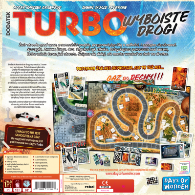 Żwir strzela spod opon, a samochód szarpie, przyprawiając Cię o mdłości, i zaczyna się obracać. Sprzęgło. Zmiana biegu. Gaz. Słychać ryk silnika. Odzyskujesz panowanie nad autem, które mknie teraz jak strzała. Ścigasz się dalej, ale musisz uważać na to, co znajduje się na drodze. Turbo: Wyboiste drogi to rozszerzenie wprowadzające boczne fartuchy – nowy wynalazek, który nie tylko zadziwi rywali, ale dzięki lepszemu wykorzystaniu aerodynamiki zwiększy Twoje szanse na zwycięstwo. Oprócz tego w pudełku znajdziesz elementy niezbędne do wprowadzenia kolejnego gracza oraz dwa zupełnie nowe tory wyścigowe. Południowoafrykańskie Grand Prix odbywa się na torze, który ze względu na zdradziecki żwir wymaga ostrożności i nerwów ze stali. Z kolei zwycięstwo na torze w Niemczech będzie zależeć od tego, jak kierowcy sobie poradzą z dużą prędkością na nowo zbudowanych szykanach. Czym jest Turbo? To ekscytująca gra planszowa, która przeniesie Cię na fotel kierowcy uczestniczącego w chaotycznych wyścigach z lat 60. Jej główny mechanizm to proste i intuicyjne zarządzanie kartami. Wybranie odpowiednich ulepszeń pozwoli Twojej wyścigówce na lepsze wchodzenie w zakręty, a także zapewni odpowiednie chłodzenie i utrzymanie największej możliwej prędkości. Ostatecznie jednak wszystko zależy od Twoich umiejętności!
