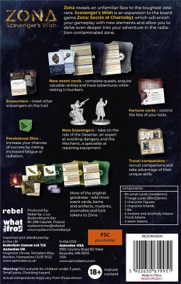 Zona: Scavenger's Wish to rozszerzenie pozwalające jeszcze mocniej zagłębić zagłębić się w przygodę w strefie skażonej radiacją. Wprowadza zupełnie nowy rodzaj kości, która odzwierciedlające nasze skoncentrowanie na zadaniu. Korzystając z niej, zwiększamy swoje szanse powodzenia, ale ryzykujemy zwiększeniem zmęczenia lub napromieniowaniem. Czekają na nas także specjalne karty fortuny reprezentujące kaprysy losu. Podczas rozgrywek z dodatkiem możemy też werbować towarzyszy, a spotkania z innymi szperaczami zyskają nowy wymiar dzięki różnym rodzajom interakcji.