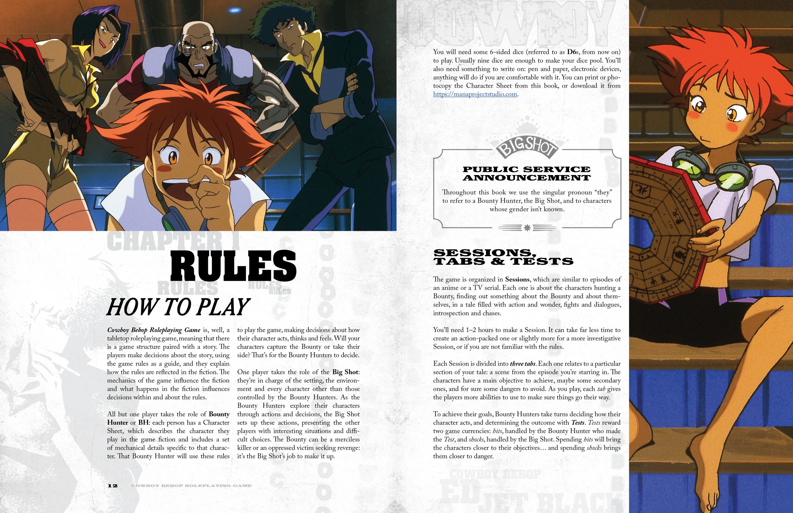 - Gotowe karty postaci ikonicznych bohaterów serii, takich jak Spike, Faye czy Ein, a także pełne zasady tworzenia własnych postaci w świecie Cowboy Bebop.