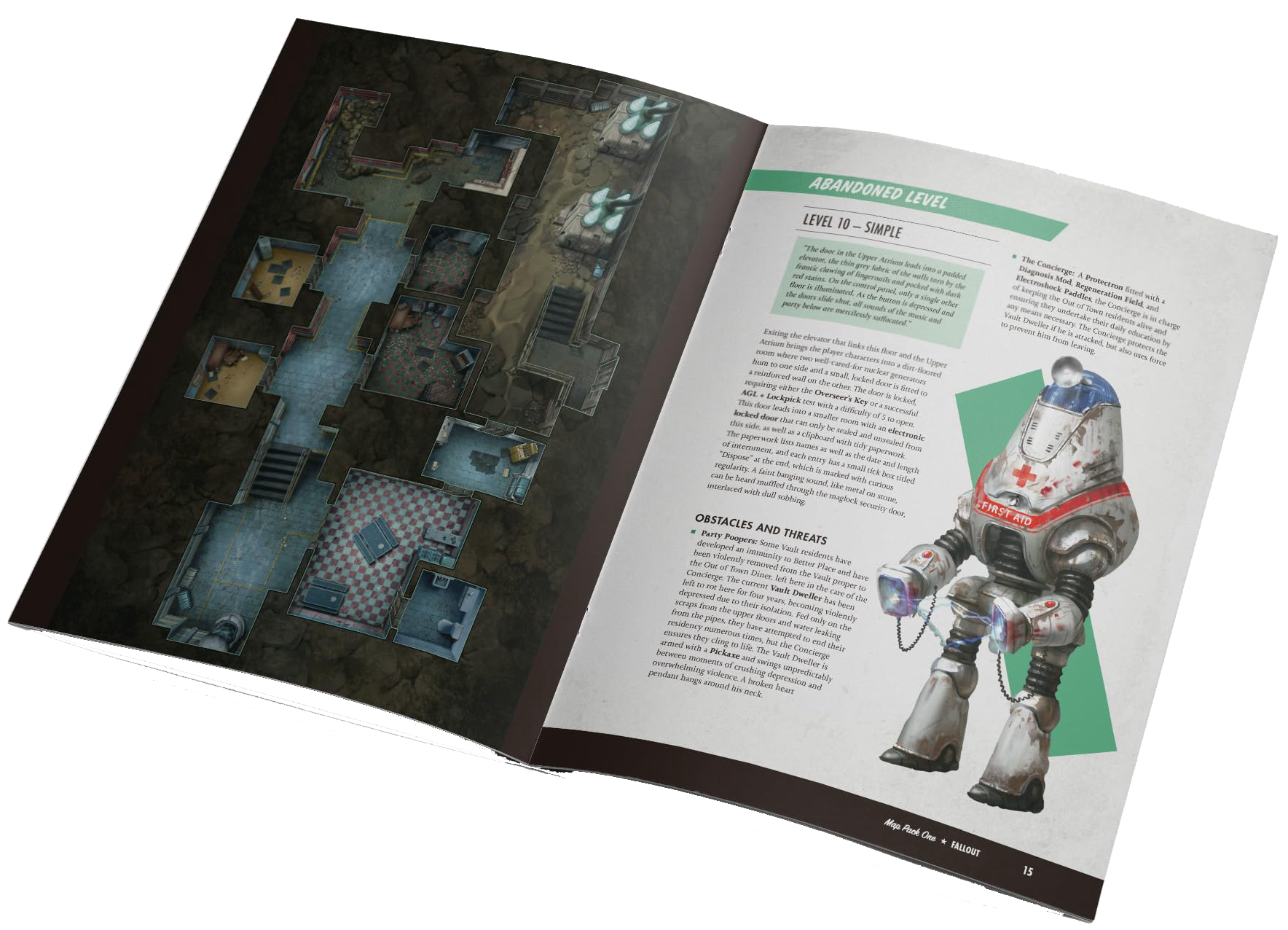 Each battlemap works as individual encounters or as part of a full quest, and are all compatible with Fallout: The Roleplaying Game and Fallout: Wasteland Warfare. Will you run the premade adventure, where your players can discover why the vault's inhabitants never want to leave, or will you use the maps to create your own insidious Vault-Tec experiments?