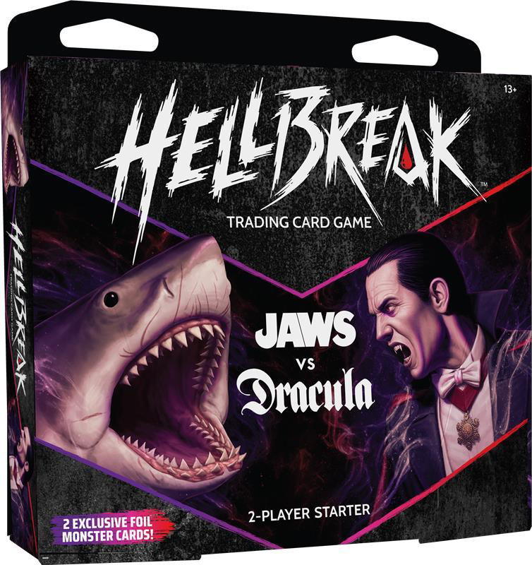 Hellbreak TCG: Dawn of Terror - 2-Player Starter Set - Jaws vs Dracula to dwie kompletne talie potworów przeznaczone dla dwóch graczy, gotowe do walki na śmierć i życie (ale głównie na śmierć).