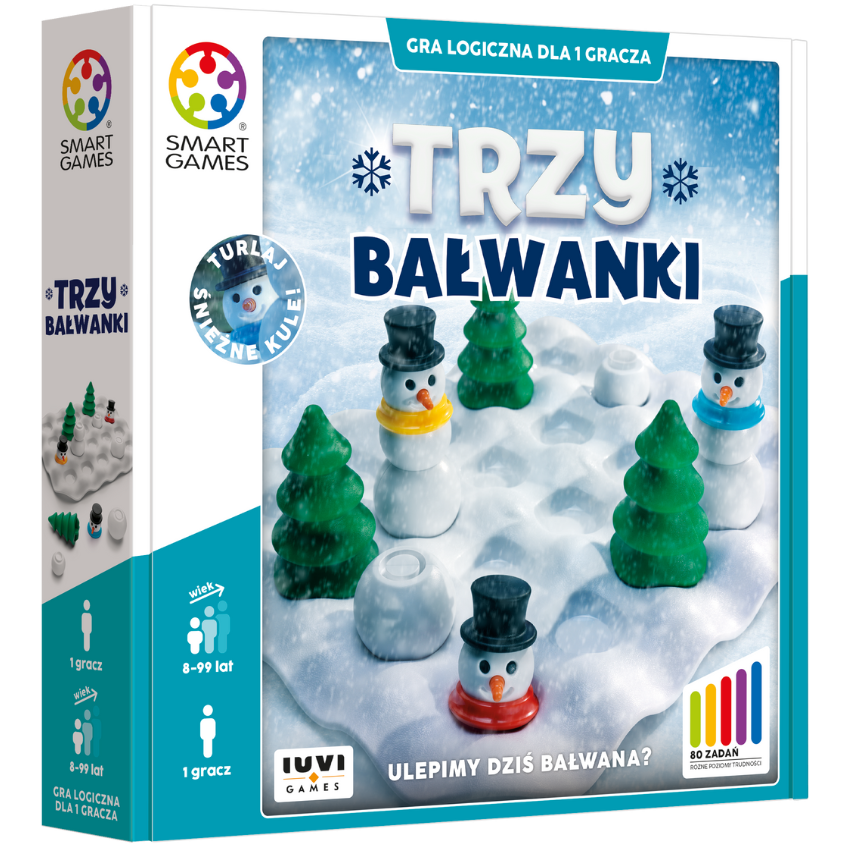Trzy Bałwanki to gra logiczna łącząca w sobie elementy logicznego myślenia ze strategicznym podejściem do rozwiązywania problemu, co skutkuje ukończeniem zadania. Składa się z 80 wyzwań ze stopniowanym poziomem trudności, od poziomu junior do wizard. Umieść na planszy początkowe elementy zgodnie z ułożeniem z wybranego przez siebie zadania. Następnie turlaj śnieżne kule po planszy tak, aby stworzyć bałwanka. Pamiętaj jednak o właściwym zachowaniu proporcji: duża kula, potem średnia, a dopiero na końcu głowa. Czy jesteś gotowy na zimową przygodę? Podejmij wyzwanie i rozwiąż wszystkie 80 zadań.