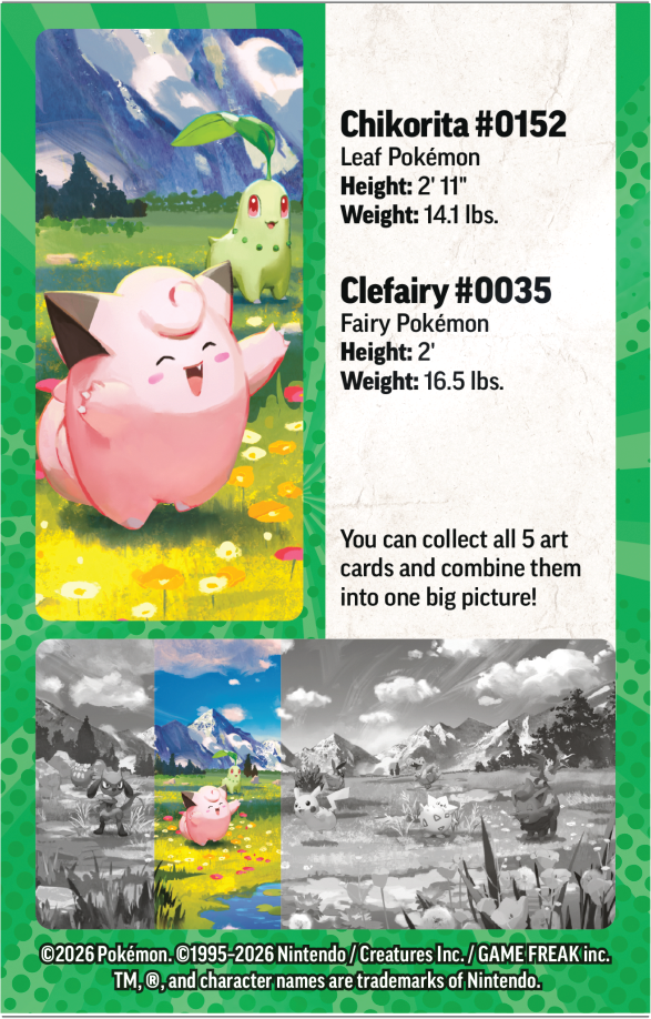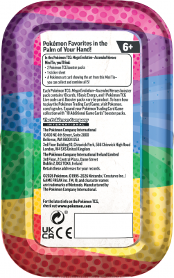 Pokémon TCG: Mega Evolution - Ascended Heroes - Mini Tin - Clefairy/Chikorita składa się z 2 boosterów, 1 arkusza naklejek i kartę z ilustracją z puszki.